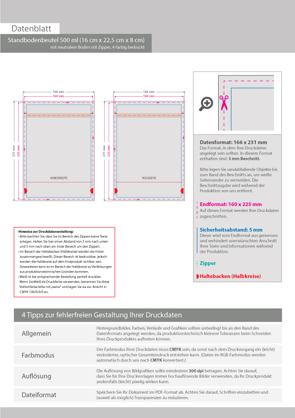 Standbodenbeutel 500 ml (16 cm x 22,5 cm x 8 cm) mit neutralem Boden mit Zipper, 4-farbig bedruckt