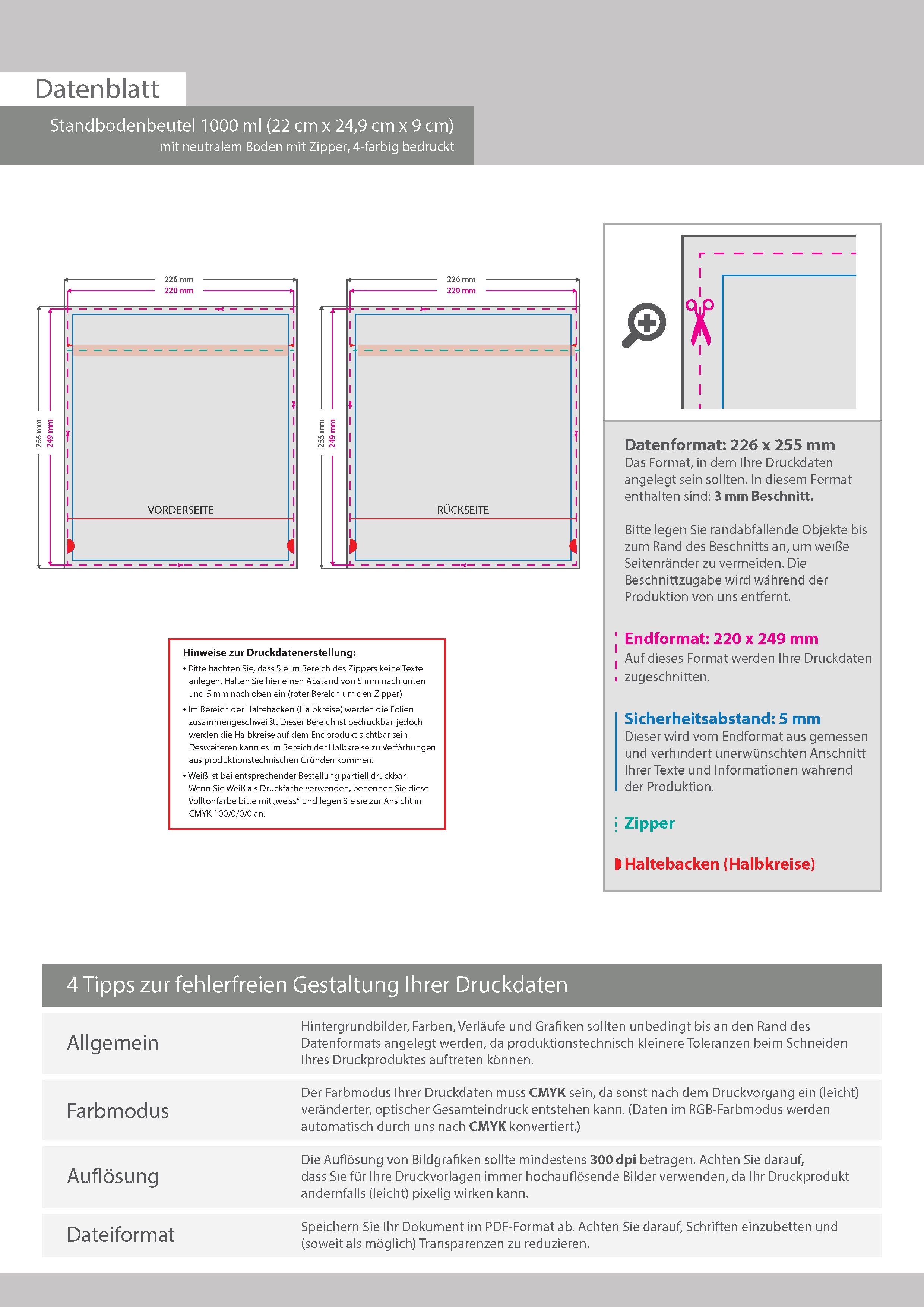 Standbodenbeutel 1000 ml (22 cm x 24,9 cm x 9 cm) mit neutralem Boden mit Zipper, 4-farbig bedruckt