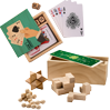 Mit unseren bedruckbaren Spielesets gelangt Ihre Werbebotschaft in die vier Wände Ihrer Zielgruppe! In unserem Shop haben Sie die Wahl zwischen unterschiedlichen Varianten: einem Karten-Würfel-Set und Geschicklichkeitsspielen. Beide Modelle kommen in einer praktischen Holzbox daher, deren Schiebedeckel wir individuell nach Ihren Wünschen bedrucken. Den vollfarbigen Digitaldruck führen wir dabei in der gewohnt herausragenden Qualität zu besonders günstigen Preisen aus.
