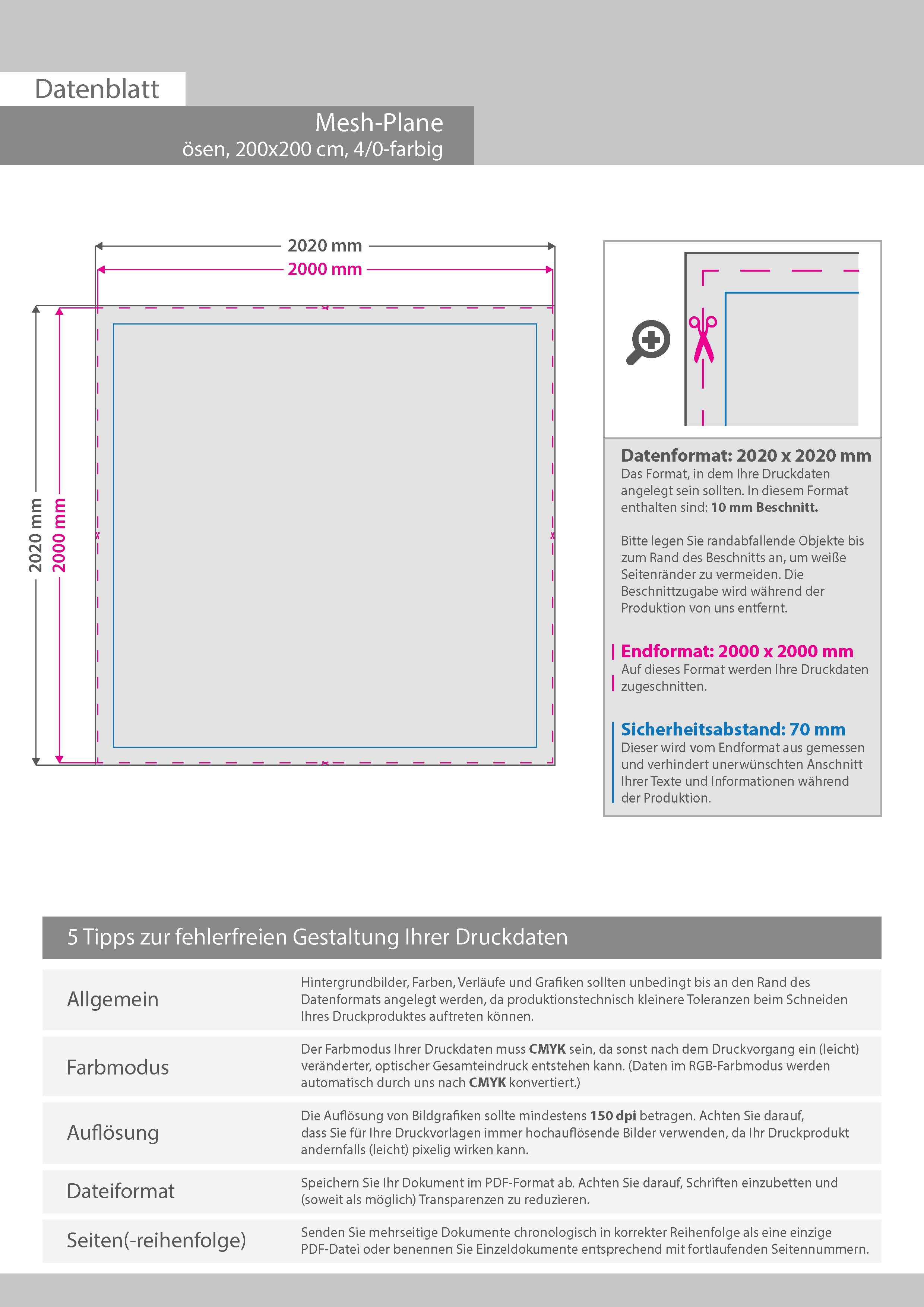 Hochwertige Mesh-Plane 200 x 200 cm, 4/0-farbig bedruckt, Ösen im Abstand von 50 cm links und rechts