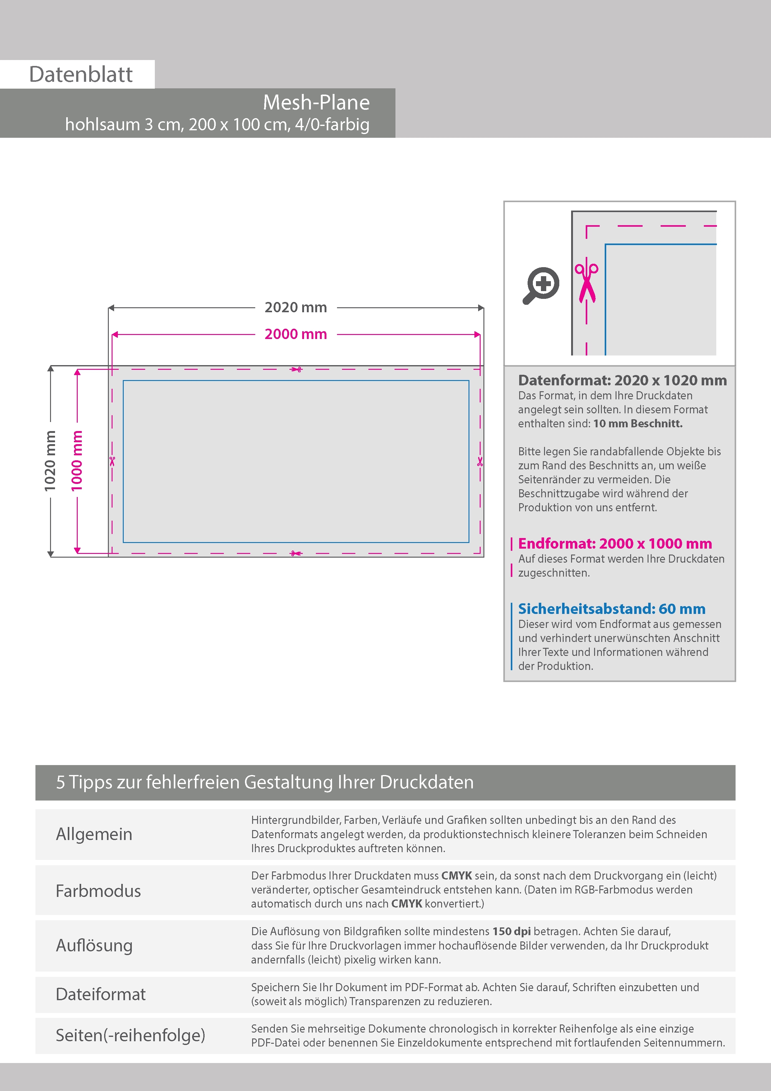 Hochwertige Mesh-Plane 200 x 100 cm, 4/0-farbig bedruckt, Hohlsaum oben und unten (Durchmesser Hohlsaum 3,0 cm)