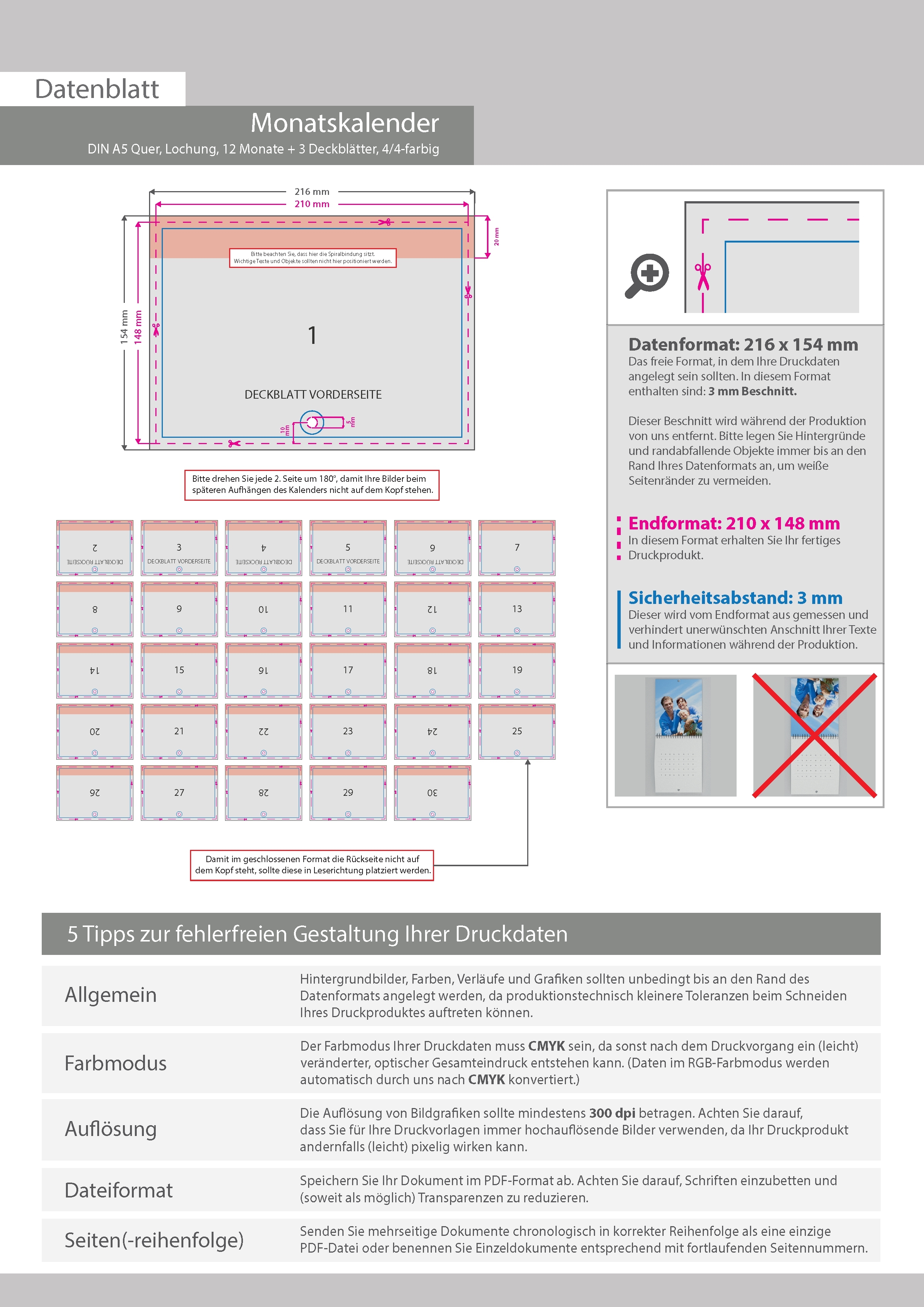 Monatskalender mit Lochung 15 Blatt (12 Monate + 3 Deckblätter)